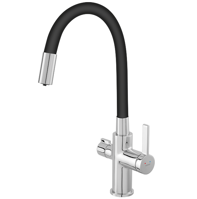 FILTRATA to kompletny system, który zmienia ergonomię w nowoczesnej kuchni. Jego sercem jest zaawansowana, dwudrożna bateria kuchenna, która umożliwia korzystanie z wody użytkowej oraz filtrowanej, bez konieczności montowania dodatkowych kraników. Bateria dostępna jest w dwóch wariantach stylistycznych: jako elegancki model w chromie z obrotową wylewką lub w nowoczesnej, matowej czerni z wylewką elastyczną. Częścią zestawu są filtry pod zlewowe FERRO, wykorzystujące węgiel aktywny i nanosrebro do redukcji zanieczyszczeń oraz poprawy smaku wody. W zależności od potrzeb można wybrać wkład o żywotności 6 miesięcy lub bardziej wydajny wariant na 12 miesięcy. System zaprojektowano zmyślą o pełnej swobodzie – bateria FILTRATA jest uniwersalna i współpracuje z dowolnymi innymi systemami filtracyjnymi dostępnymi na rynku.